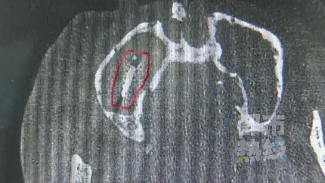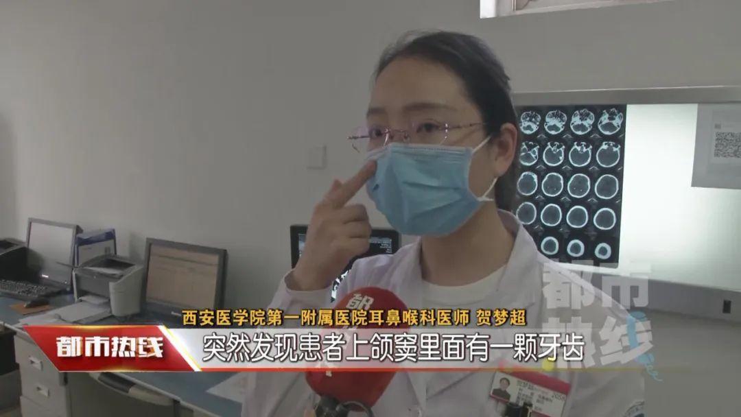 西安醫(yī)學(xué)院第一附屬醫(yī)院耳鼻喉科醫(yī)師賀夢超:“一星期前,患者因流鼻涕、打噴嚏等癥狀來就醫(yī) ,在我們經(jīng)過仔細檢查后發(fā)現(xiàn),患者右側(cè)上頜竇里竟然有種植牙的牙根殘端 ?!?/p>