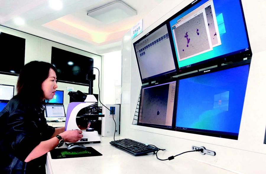 9月2日,呼和浩特市賽罕區(qū)氣象臺工作人員在利用顯微鏡監(jiān)測花粉顆粒數(shù) 安路蒙攝