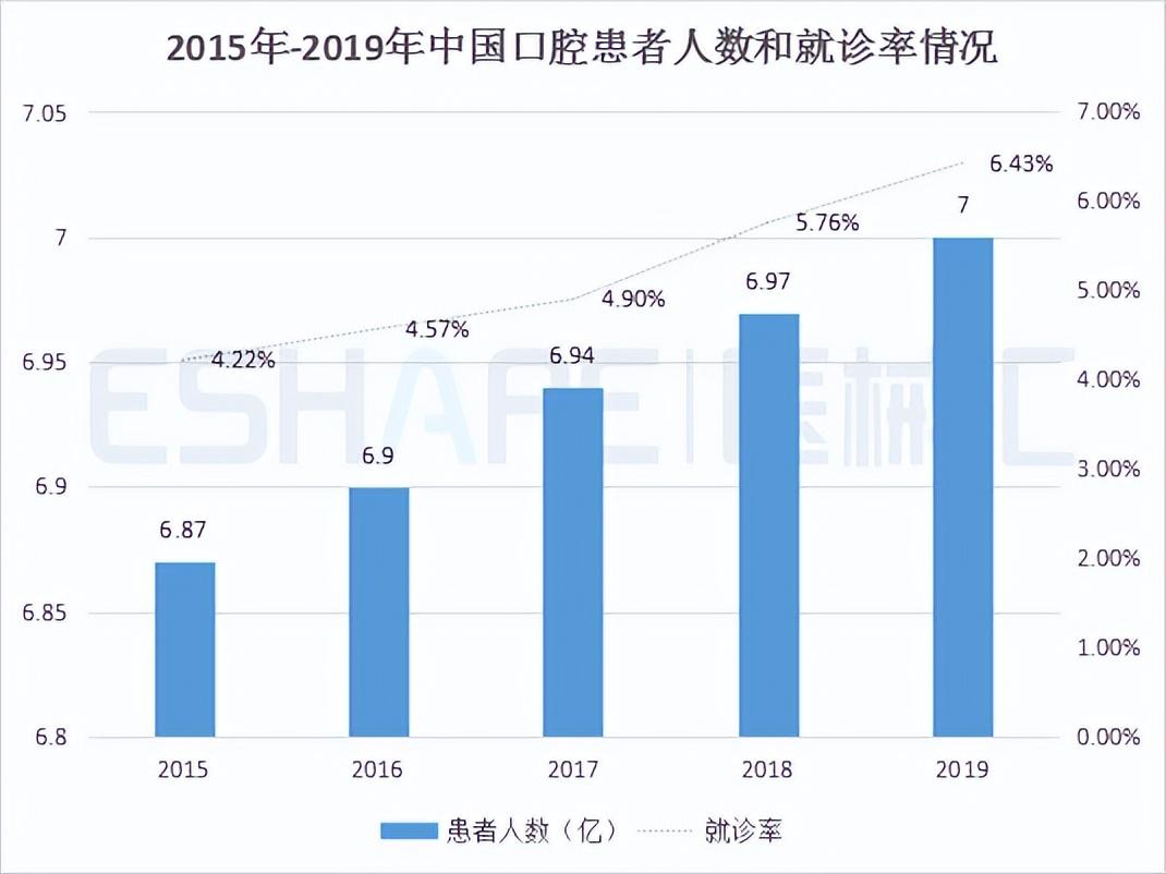 截至2019年,我國口腔患者人數(shù)已達到7億人,約占國民總?cè)藬?shù)的50%,而就診率僅為6.43%。我國患有口腔疾病的群體逐年上升,但就診率卻得不到較大提升,口腔疾病的調(diào)節(jié)仍然被很多人忽視。