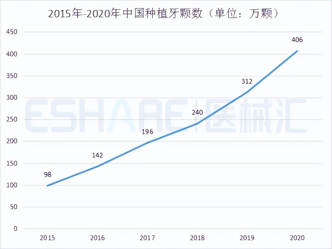據(jù)《2020年中國口腔醫(yī)療行業(yè)報告》數(shù)據(jù)顯示,2020年我國種植牙數(shù)量約為406萬顆,目前我國種植牙市場規(guī)模已近1600億元,是增長快的種植牙市場之一。
