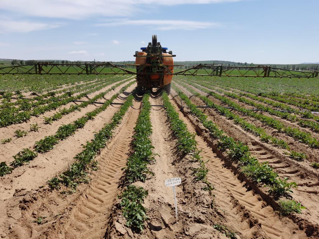 五寨縣現(xiàn)代加工型馬鈴薯種植示范基地里,農(nóng)民在對馬鈴薯進(jìn)行田間植保。(受訪者供圖)