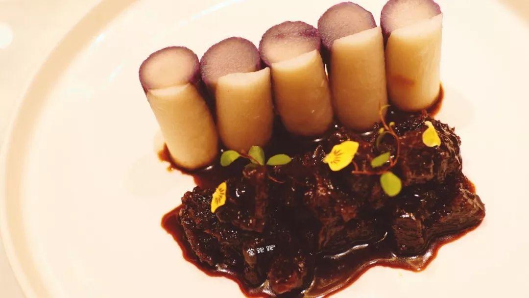 山藥配燒汁牛肉:山藥蒸熟后用藍(lán)莓汁、冰糖水浸泡入味,搭配燒汁牛肉粒。