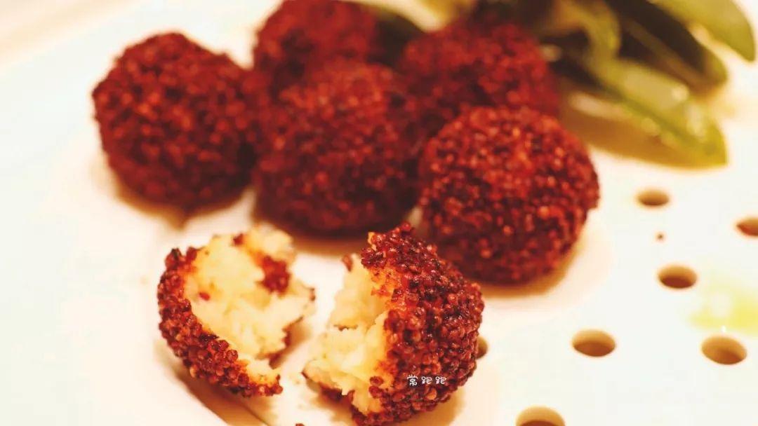 楊梅藜麥河蝦球:取材長(zhǎng)江蝦。剝殼取肉斬成茸,加馬蹄丁、調(diào)味料,攪拌均勻,裹上藜麥炸制成熟,形似楊梅,鮮香脆甜。喜歡吃蝦的我,對(duì)這道菜偏愛(ài)有佳。