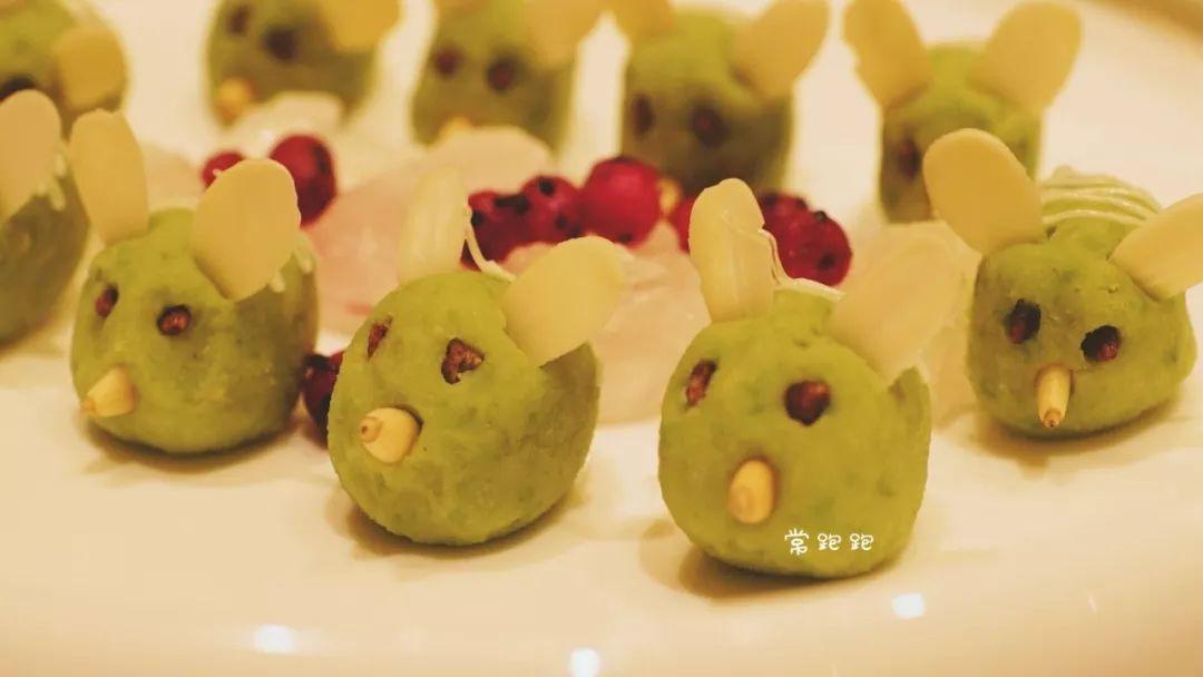 糯甜小兔青豆泥:青豆瓣焯水搗成泥,加煉乳、白糖、香油拌入味,捏成型后用杏仁片等點(diǎn)綴成小兔子。