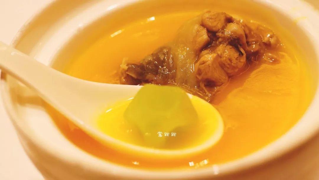 蛋簍濃湯江甲魚(yú):長(zhǎng)江甲魚(yú)切成塊,焯水后加鮮湯燉至酥軟,雞蛋雕成魚(yú)簍狀,青筍雕至骰子狀,湯汁香醇可口。