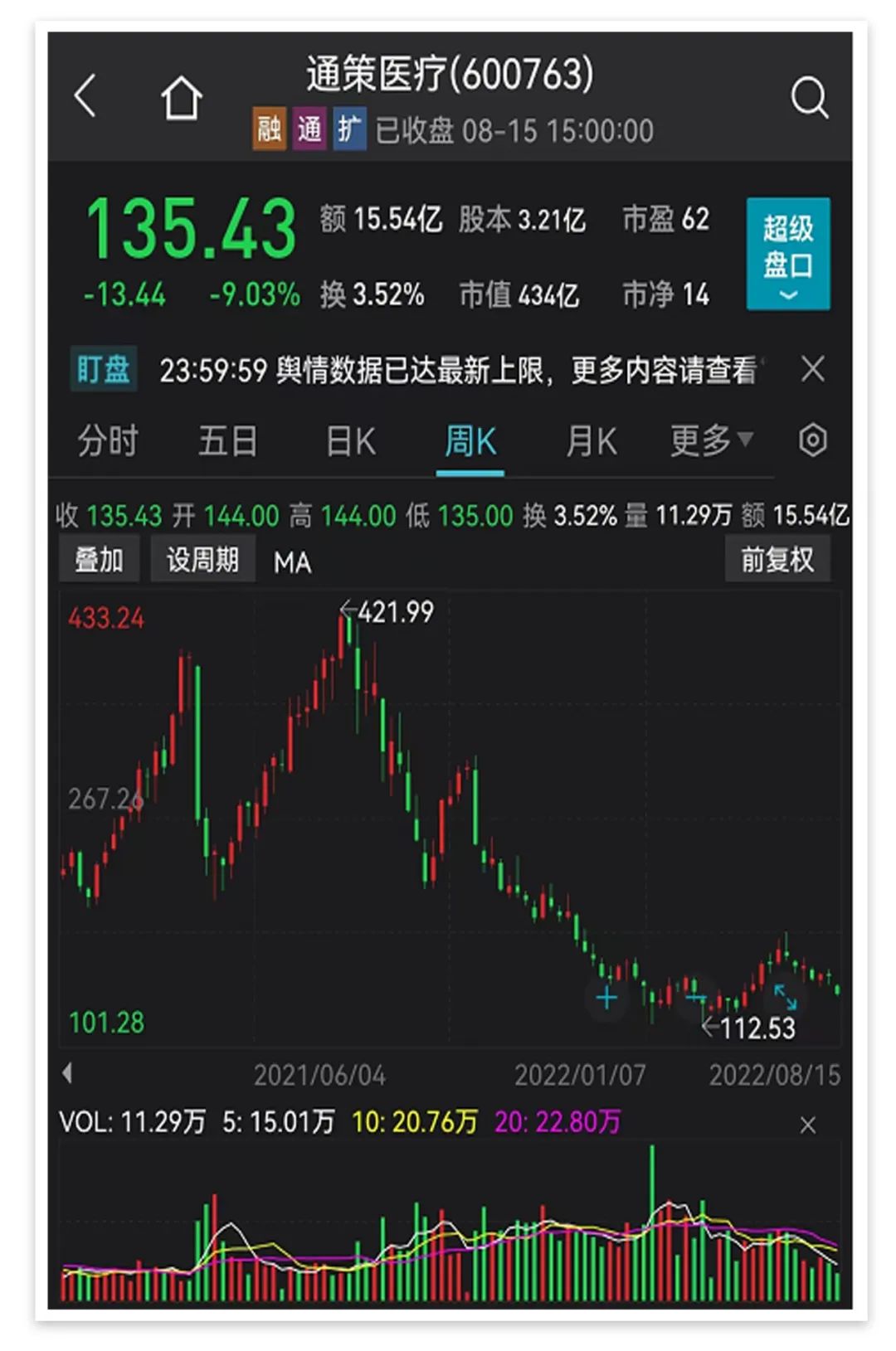 8月15日,有“牙茅”之稱的通策醫(yī)療低開低走,收盤大跌9.03%,股價(jià)報(bào)135.43元/股。