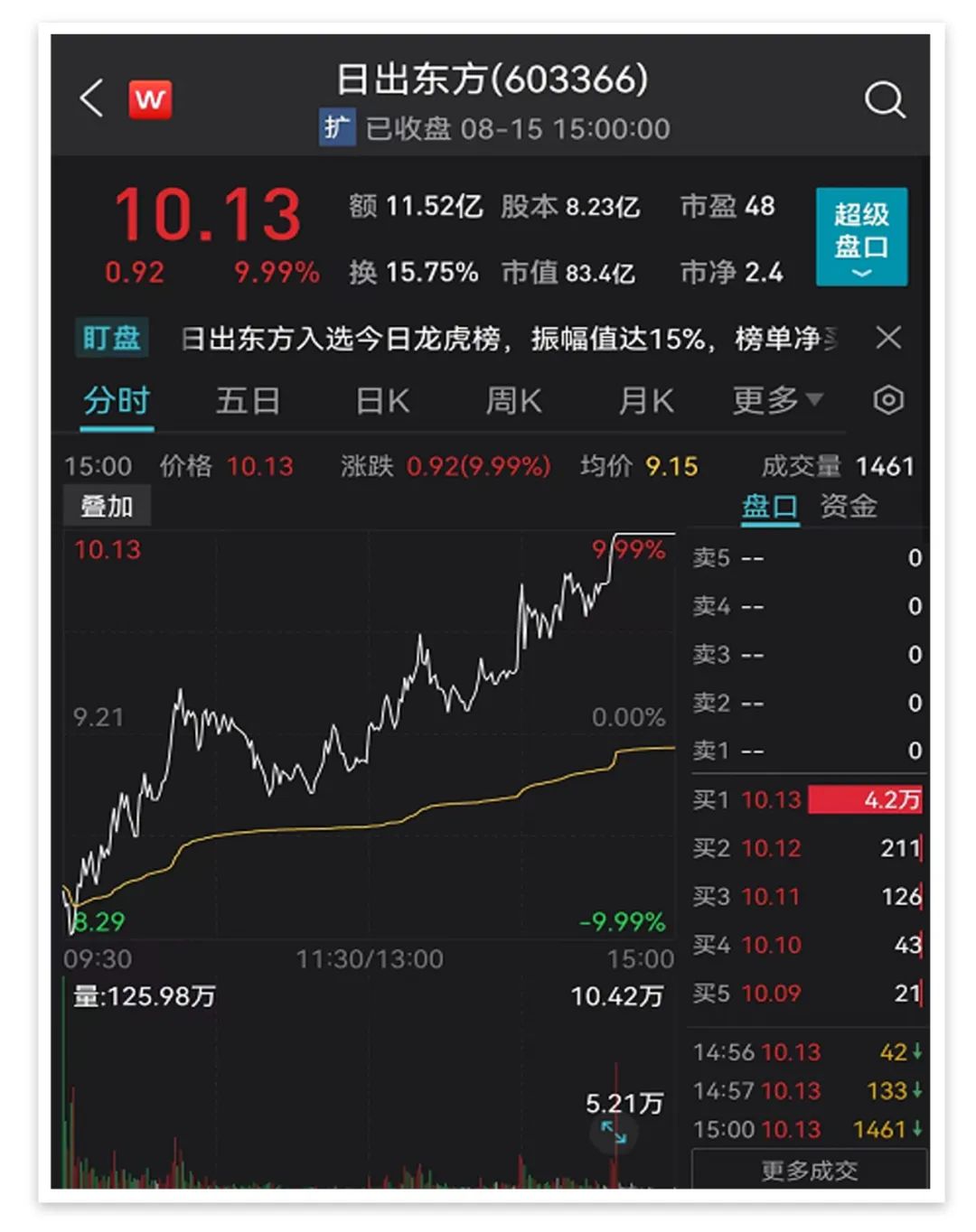 日出東方早盤一度觸及跌停,午后則大幅拉升,尾盤漲停,上演“地天板”,收?qǐng)?bào)10.13元/股,市值83億元,成交額超11億元。
