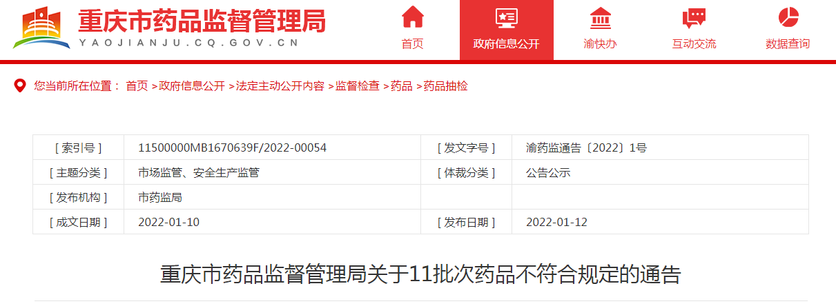 中國質(zhì)量新聞網(wǎng)訊 2022年1月12日,重慶市藥品監(jiān)督管理局網(wǎng)站發(fā)布關(guān)于11批次藥品不符合規(guī)定的通告。通告稱,為了加強(qiáng)藥品質(zhì)量監(jiān)督管理,規(guī)范市場秩序,保障公眾用藥,該局組織局屬檢查局、各區(qū)縣藥品監(jiān)管部門和檢驗(yàn)機(jī)構(gòu)開展藥品抽檢。經(jīng)重慶市食品藥品檢驗(yàn)檢測研究院等檢驗(yàn)機(jī)構(gòu)檢驗(yàn),標(biāo)示為廣西慧寶源醫(yī)藥科技有限公司等9家企業(yè)(醫(yī)院)生產(chǎn)(配制)的11批次藥品不符合規(guī)定。