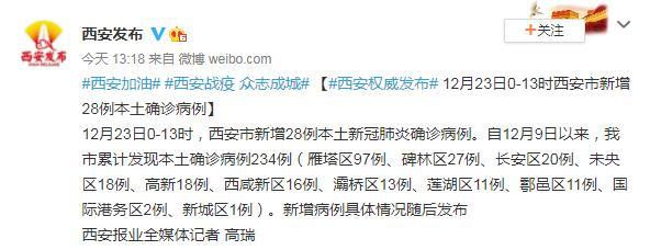 另據(jù)西安發(fā)布今天下午消息:12月23日0—13時(shí),西安市新增28例本土新冠肺炎確診病例。自12月9日以來,西安市累計(jì)發(fā)現(xiàn)本土確診病例234例(雁塔區(qū)97例、碑林區(qū)27例、長(zhǎng)安區(qū)20例、未央?yún)^(qū)18例、高新18例、西咸新區(qū)16例、灞橋區(qū)13例、蓮湖區(qū)11例、鄠邑區(qū)11例、國(guó)際港務(wù)區(qū)2例、新城區(qū)1例)。
