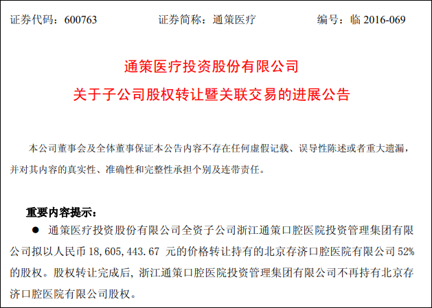 以北京地區(qū)為例:2007年12月,通策醫(yī)療以800萬元收購“北京通策京朝口腔醫(yī)院”(即后來的“北京存濟口腔醫(yī)院”),作為其布局省外的重要戰(zhàn)略舉措。2013年-2016年間,北京存濟分別虧損30萬元、29萬元、219萬元和211.67萬元。2016年10月,通策醫(yī)療發(fā)布公告,擬將該醫(yī)院52%股權出售給浙江通策口腔醫(yī)療投資基金。北京存濟口腔醫(yī)院遭到剝離。