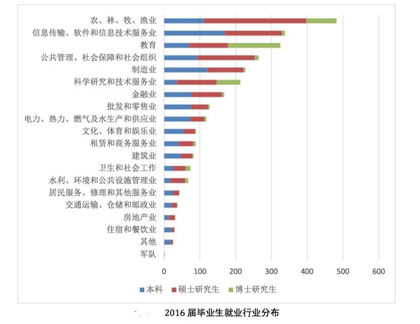 與此同時,記者在中國農(nóng)業(yè)大學(xué)的官網(wǎng)上找到一份《中國農(nóng)業(yè)大學(xué)2018年畢業(yè)生就業(yè)質(zhì)量報告》,依照統(tǒng)計局行業(yè)分類標(biāo)準(zhǔn),中國農(nóng)業(yè)大學(xué) 2018 屆畢業(yè)生就業(yè)行業(yè)前三位分別為農(nóng)林牧漁業(yè),教育,公共管理、社會保障和社會組織。農(nóng)林牧漁業(yè)作為中農(nóng)大的傳統(tǒng)就業(yè)方向,2018屆5144位畢業(yè)生里有超過400位投入其中進行擇業(yè)。而2017年,具體數(shù)據(jù)沒有標(biāo)注。而同一網(wǎng)站上,2016年的數(shù)據(jù)報告則表明,當(dāng)屆有近500位畢業(yè)生選擇農(nóng)林牧漁業(yè)進行就業(yè)。再把目光跳回2015年時,當(dāng)屆選擇同一領(lǐng)域的畢業(yè)生則逼近700人。