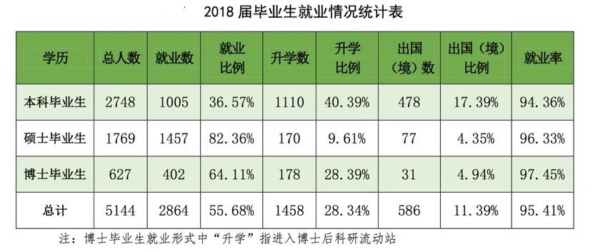 《中國農(nóng)業(yè)大學(xué)2018年畢業(yè)生就業(yè)質(zhì)量報告》顯示,中國農(nóng)業(yè)大學(xué)2018屆畢業(yè)生共5144人,其中本科畢業(yè)生2748人,1005人畢業(yè)后參加工作,就業(yè)比例達到36.57%。而當(dāng)屆畢業(yè)生升學(xué)數(shù)則為1110人(升學(xué)比例40.39%),以微弱優(yōu)勢高于就業(yè)人數(shù)。此外,另有478位畢業(yè)生選擇畢業(yè)后出國。