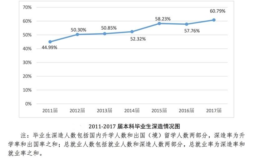 對此,記者在2017年的就業(yè)質(zhì)量報告中,找到了中國農(nóng)業(yè)大學(xué)官方披露的2011-2017屆本科畢業(yè)生深造情況圖表,在這份統(tǒng)計里,學(xué)校把國內(nèi)外升學(xué)人數(shù)做了統(tǒng)一計算、對比。從圖中觀察,2011屆本科畢業(yè)生升學(xué)率為44.99%,而到了2017屆時,本科畢業(yè)生的升學(xué)率迅速竄升至60.79%,并存在逐年上升趨勢。