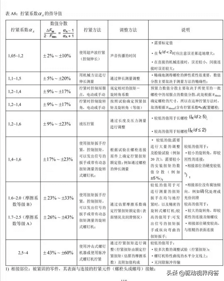 (2)基于分析模型計算螺栓擰緊力矩第1步:計算差速器輸出的大扭矩Tmax,Tmax=T*u*η;式中,T-輸入扭矩,u-大總速比,η-傳遞率。第2步:計算單個差速器螺栓所承受的橫向作用力Fq=Tmax/(i*R);式中,i-螺栓個數(shù),R-螺栓中心到差速器中心的距離。第3步:計算小緊固作用力Famin為了傳遞橫向作用力,在內(nèi)分界面處需要一個小緊固作用力Famin。Famin=Fq/(qF*f);式中,qF-內(nèi)部力傳遞界面數(shù)量,f=界面摩擦系數(shù)。第4步:確定作用力損耗Fz,F(xiàn)z=fz/(Xs+Xp);式中,fz-塑形變形量,Xs-彈性回彈力,Xp-同心回彈力。Xs和Xp公式參見VDI-2230,根據(jù)實際情況進行計算。第5步:計算小安裝預(yù)緊力Fmin,不考慮熱影響(△Fvth=0)及軸向載荷。Fmin=Famin+Fz;第6步:大安裝預(yù)緊力Fmax,F(xiàn)max=αA*Fmin;式中,αA-擰緊力矩系數(shù)(參見圖1選?。?。第7步:計算螺栓擰緊力矩M,Mmin=K*Fmax*d。式中,K-擰緊力系數(shù)(參見圖2選取),d-螺紋公稱直徑。根據(jù)計算步驟,即可求出螺栓擰緊力矩。計算中可參參考VDI-2230進行。