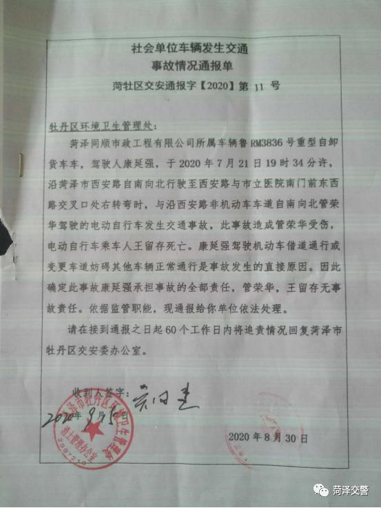 菏澤市交通警察支隊(duì)牡丹區(qū)大隊(duì)及時(shí)將該事故調(diào)查情況上報(bào)菏澤市牡丹區(qū)交安委,要求相關(guān)主管部門對(duì)同順市政工程有限公司監(jiān)管職責(zé)執(zhí)行不到位的問題作出處理,9月15日牡丹區(qū)交安委向牡丹區(qū)環(huán)境衛(wèi)生管理處下達(dá)社會(huì)單位車輛發(fā)生交通事故情況通報(bào)單要求牡丹區(qū)環(huán)境衛(wèi)生管理部門對(duì)同順市政工程有限公司相關(guān)調(diào)查處理工作。