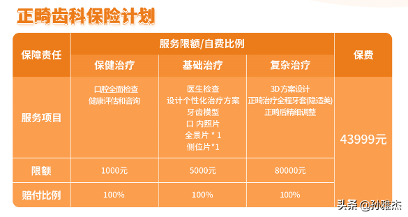 3)、復(fù)雜調(diào)節(jié)包括深度牙周調(diào)節(jié)、齒科手術(shù)、復(fù)雜根管調(diào)節(jié)、恒牙、根管調(diào)節(jié)、復(fù)雜拔牙;齒科固定修復(fù)、活動修復(fù)、美容修復(fù)、修復(fù)性充填;牙齒種植和齒科正畸調(diào)節(jié)等。一年的保額是2000元。