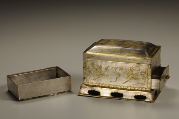 唐鎏金飛天仙鶴紋銀茶羅子。