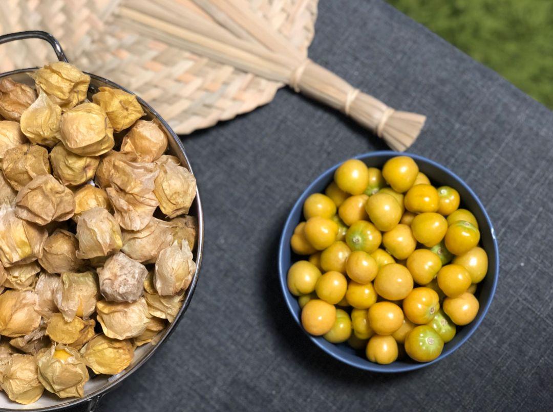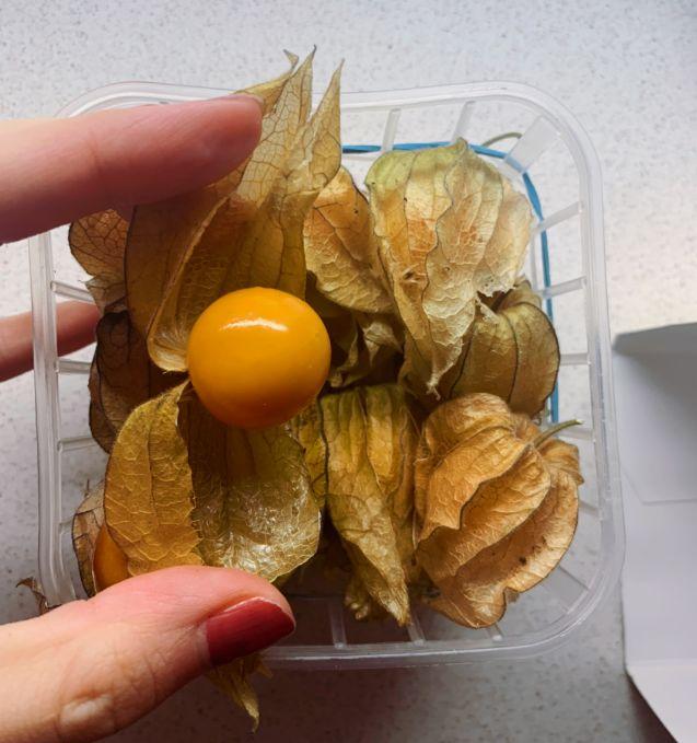 姑娘果像一顆糖紙包裹起來的糖,外面有一層薄薄的牛皮紙般的外皮,里面才是金黃色的果子本體。