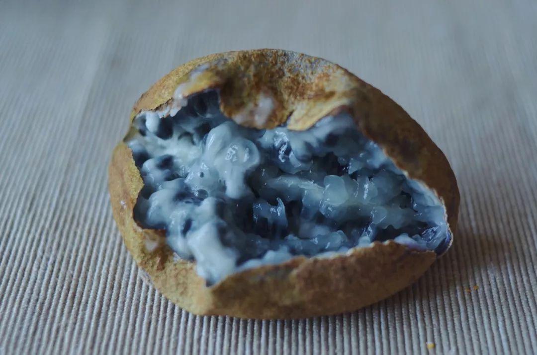 成熟之后的八月瓜表皮會(huì)裂出一條縫,露出果肉來,八月瓜的果肉不多,白白一層包著密實(shí)的黑色種子。