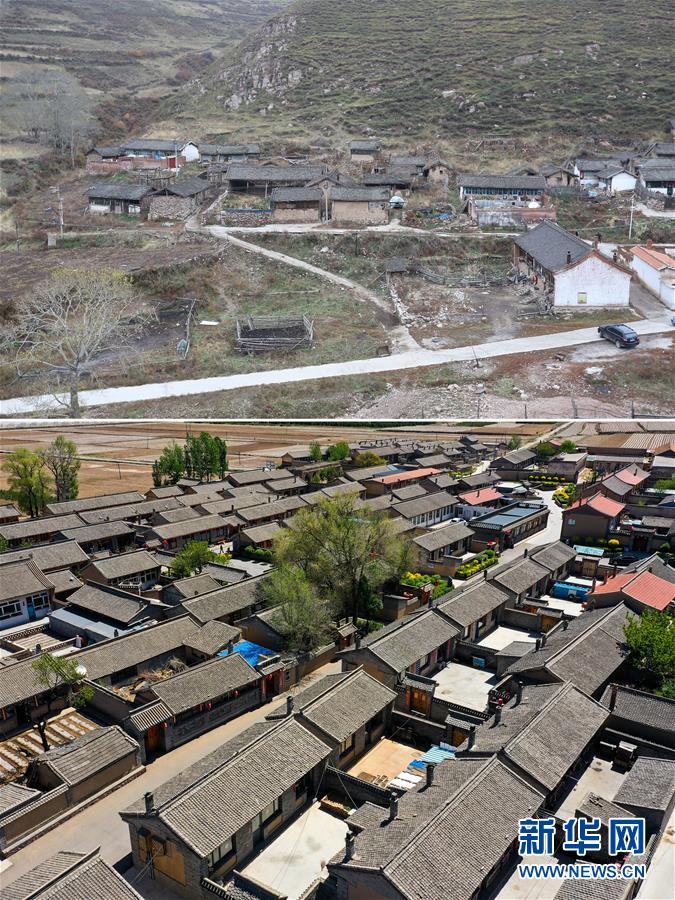 拼版照片:上圖為山西省忻州市岢嵐縣宋家溝村村民在整村搬遷前居住的房屋(資料照片);下圖為5月19日拍攝的山西省忻州市岢嵐縣宋家溝村(無人機照片,新華社記者曹陽攝)。新華社發(fā)