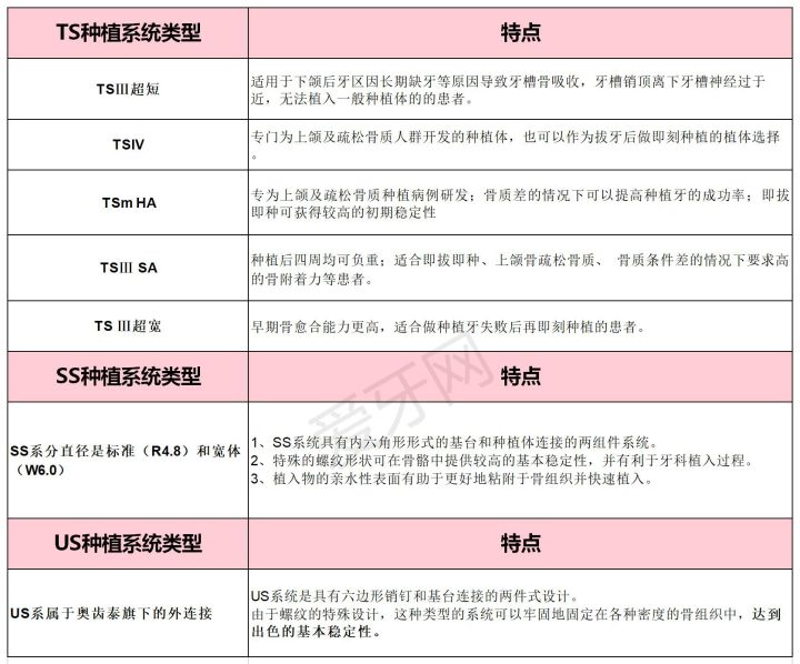 目前奧齒泰種植體旗下有三個(gè)系列,分別是常用的GS/TS系列,SS系列,US系列。這里給大家先簡單總結(jié)一下這三個(gè)系列的區(qū)別: