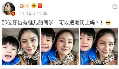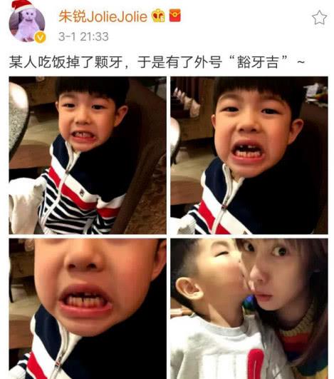 3月1日,胡可的閨蜜、安吉的干媽朱銳在微博上貼出了安吉的照片,并寫道:某人吃飯掉了顆牙,于是有了外號(hào)“豁牙吉”。