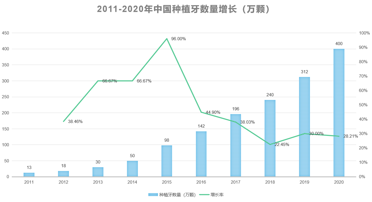 據(jù)中泰證券研報顯示,2020年我國種植量約400萬顆,換句話說,中國每萬人種植牙數(shù)達到了28顆。而在此前的10年間,中國種植牙數(shù)量復合增速達到了驚人的46%。