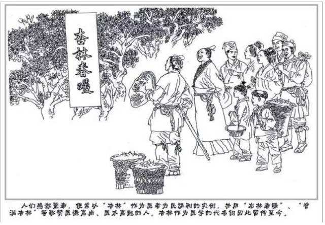 相傳三國時,名醫(yī)董奉隱居廬山。他為人看病從不收診金,只要被的病人種植杏樹。幾年以后,被者,而杏樹也有了十余萬株,蔚然成林。每當(dāng)杏熟的時候,董奉便貼出告示,凡是到此買杏者,不收銀錢,得用稻谷來換杏。然后董奉又將收到的稻谷,悉數(shù)用于救濟(jì)窮苦百姓。鄉(xiāng)民們敬佩董奉的人品和醫(yī)德,便寫了"杏林春暖"的條幅掛在他家門口。從這以后,“醫(yī)者父母心,杏林天使情”這句詩詞被傳承下來,"杏林春暖"一詞更是突出醫(yī)者仁慈之心的寬大,甚至還沿用至今。