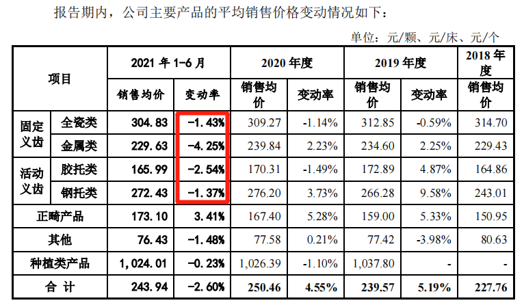 家鴻口腔主要產(chǎn)品的銷售均價也有所下滑。招股書顯示,2021年上半年,公司固定義齒收入占總營業(yè)收入的比例為57.46%,活動義齒收入占總營業(yè)收入的比例為20.69%。