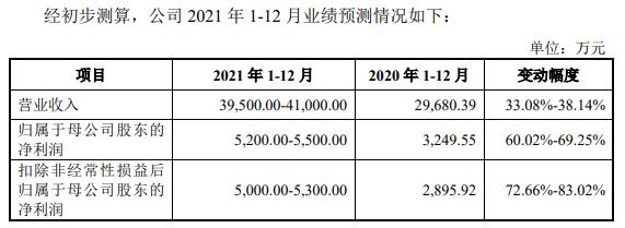 家鴻口腔預(yù)計2021年1-12月營業(yè)收入為3.95億元至4.10億元,同比增長33.08%至38.14%;預(yù)計歸屬于母公司股東的凈利潤為5200.00萬元至5500.00萬元,同比增長60.02%至69.25%;預(yù)計扣除非經(jīng)常性損益后歸屬于母公司股東的凈利潤為5000.00萬元至5300.00萬元,同比增長72.66%至83.02%。