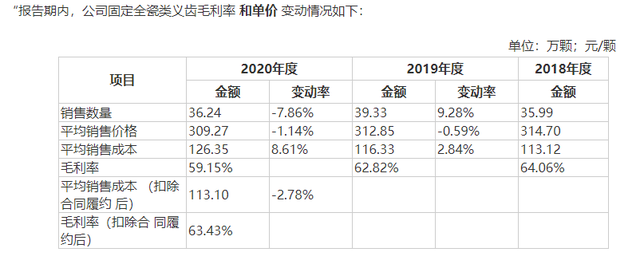 2018-2020年,固定全瓷義齒銷售均價分別為314.70元/顆、312.85元/顆和309.27元/顆,然而其單位成本分別為113.12元/顆、116.33元/顆和126.35元/顆。也就是說,一顆假牙的成本也不過百元,但是種植一顆牙至少花費(fèi)上萬元。