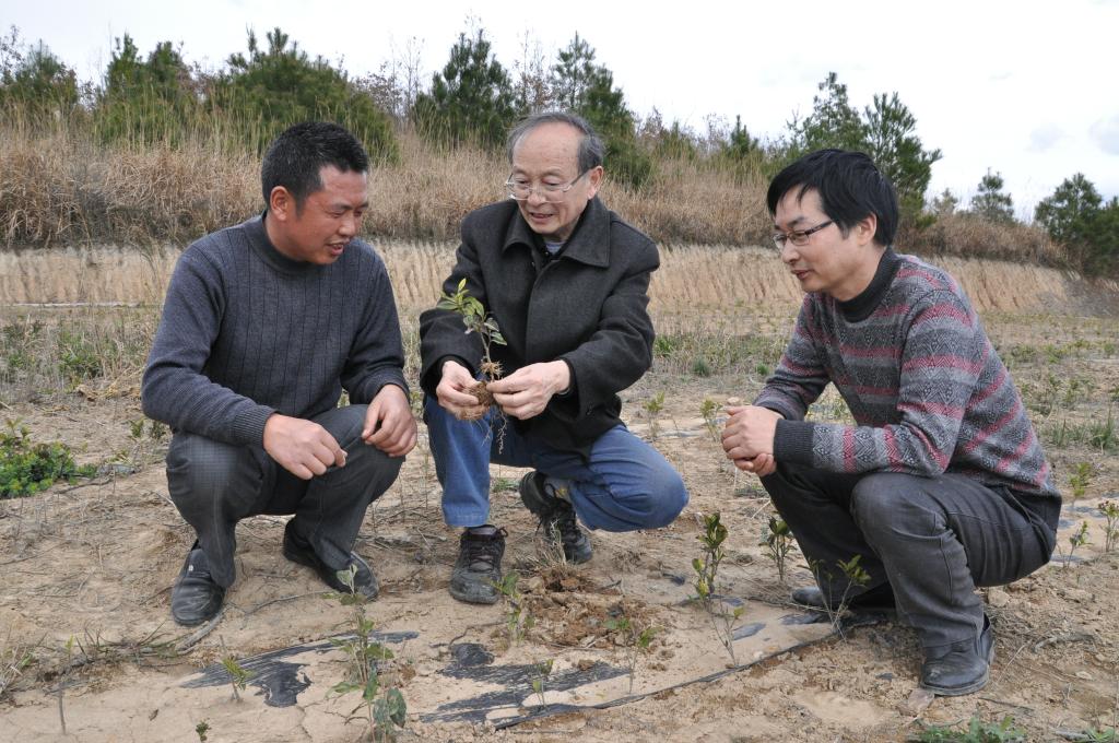 中國農(nóng)業(yè)科學院茶葉研究所原副所長白堃元(中)在四川廣元與當?shù)夭柁r(nóng)交流茶葉種植技術(2015年3月27日攝)。新華社發(fā)