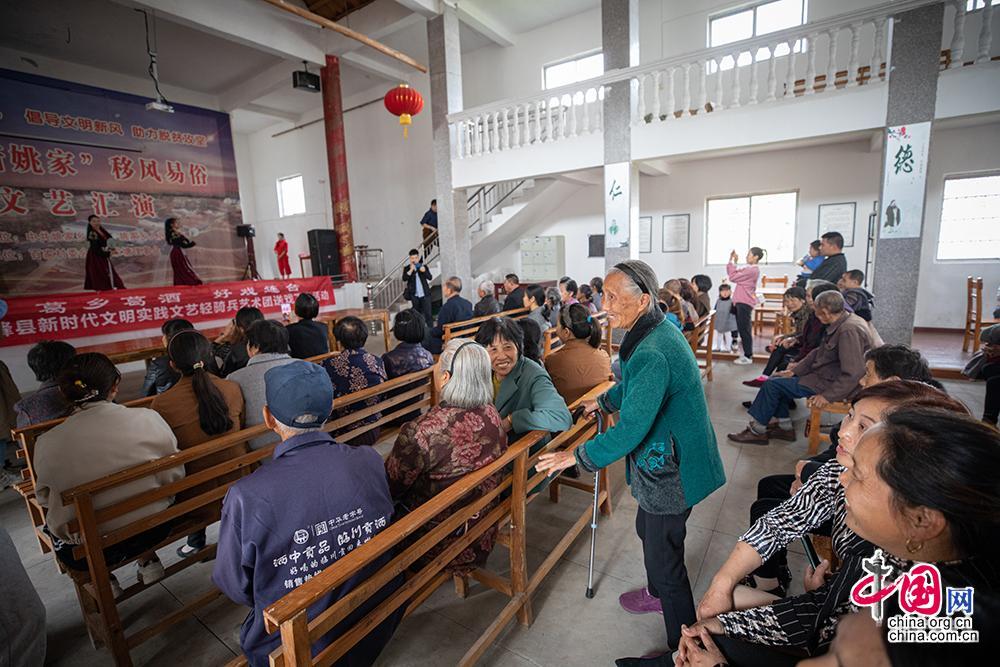 在蘇家塘活動(dòng)中心,村民們正在觀看藝術(shù)團(tuán)送戲下鄉(xiāng)活動(dòng)演出。蘇家塘以文化活動(dòng)中心為依托,整合居家養(yǎng)老服務(wù)中心,通過集體經(jīng)濟(jì)供養(yǎng)全村70歲以上的老人在這里享受免費(fèi)午餐。中國網(wǎng)記者倫曉璇攝