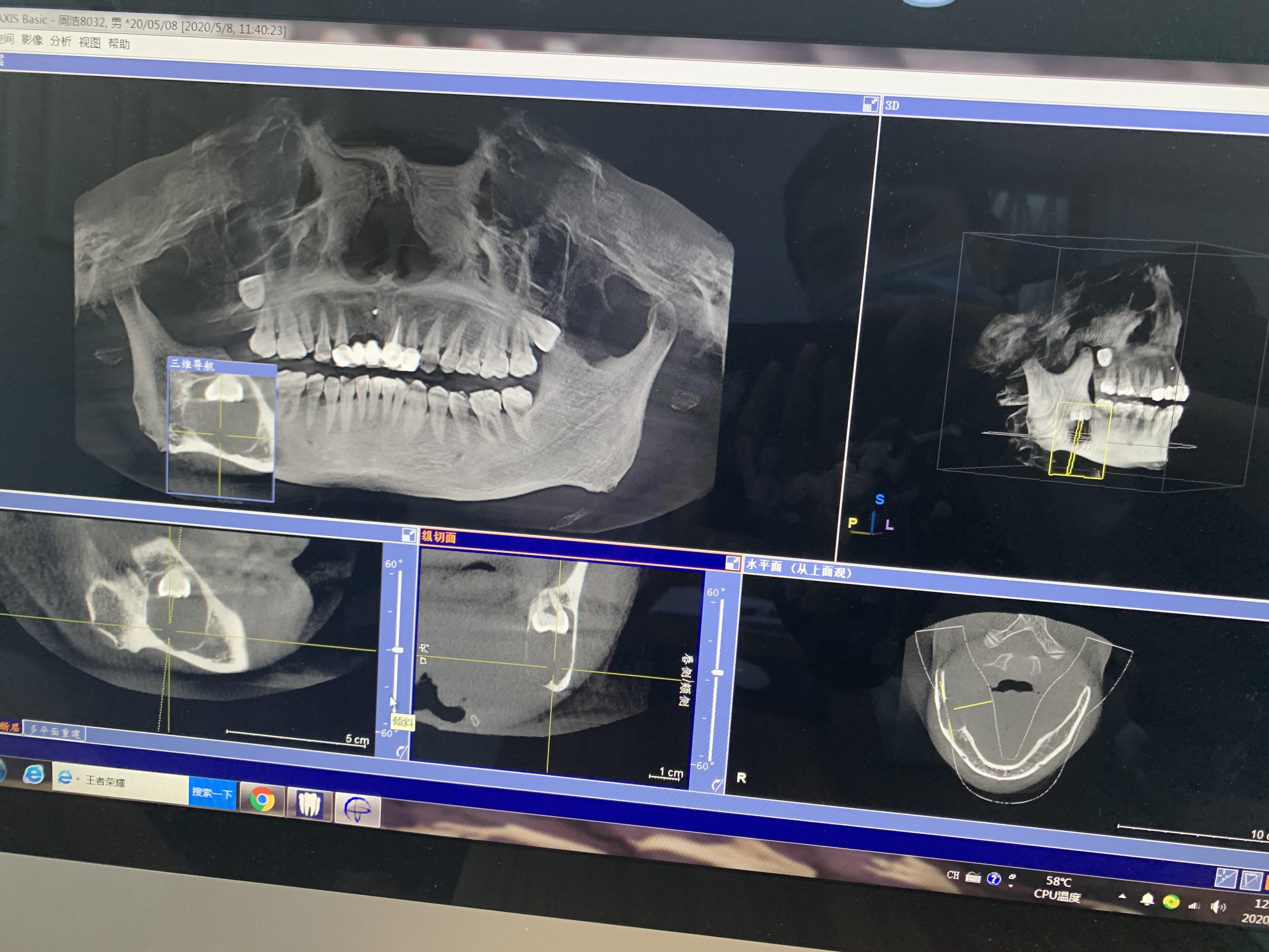5月7日半夜被疼醒,感覺右側(cè)臉腫起來(lái)了,疼的厲害,整個(gè)頭皮都是疼的,我才知道這不是上火,懷疑是智齒,一晚上都沒睡著,第二天一大早,我家附近就有牙博士口腔,到那后馬上拍了一張片子,我心里在想,如果是智齒,那就趕緊拔了吧,太痛苦了,做好了拔牙和吃稀飯的思想準(zhǔn)備,可當(dāng)片子出來(lái)后,給我的卻是一個(gè)晴天霹靂。